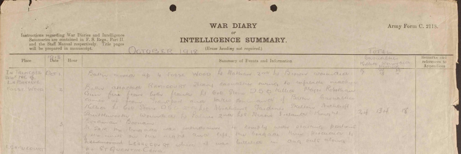 ‘16LancashireFusiliersWDOct1918’ 16/Lancashire Fusiliers War Diary excerpt (source: National Archives)
