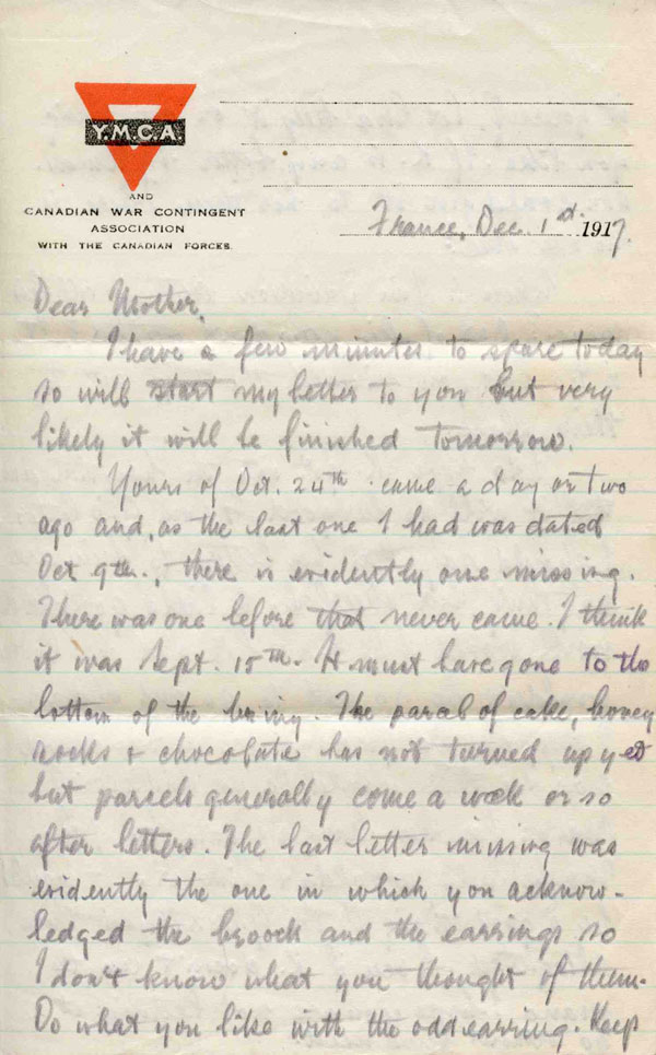 A letter written to his mother from the 72nd Battalion’s position near Auchel in northern France on Dec. 1, 1917.