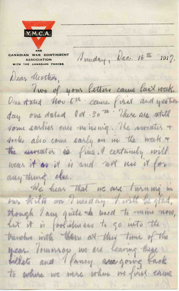 The Battalion spent the Sunday afternoon preparing for the move that Harry alludes to in this letter. On Monday they moved from Auchel to Canada Camp at Chateau de la Hare and then to Dawson Lines. They were subsequently ordered to relieve the 1st Canadian Infantry Battalion and entered the trenches on Dec. 19th.