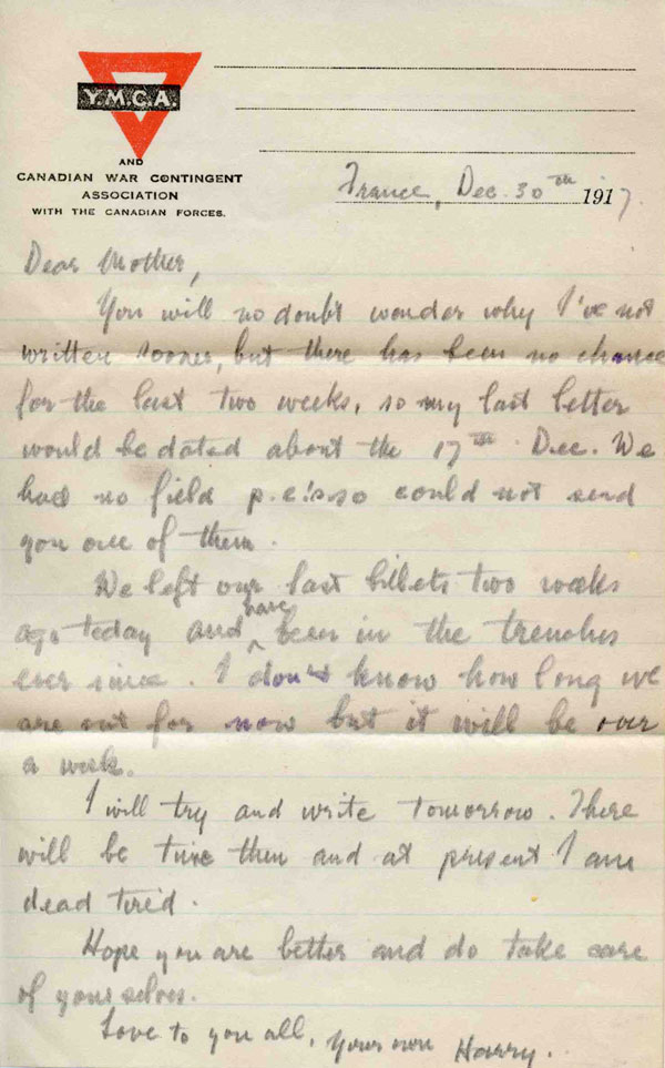 A brief letter written to his mother from the 72nd Battalion’s position at Vancouver Camp, Chateau de la Hare on Dec. 30, 1917.