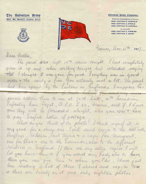A letter written to his mother while in France. He didn’t return to his Battalion until November 23 so it is likely he was at the 4th Canadian Infantry Base Depot at this time (in this letter he suggests his mother should ship parcels to the Depot and “if I have gone they will be forwarded alright”).