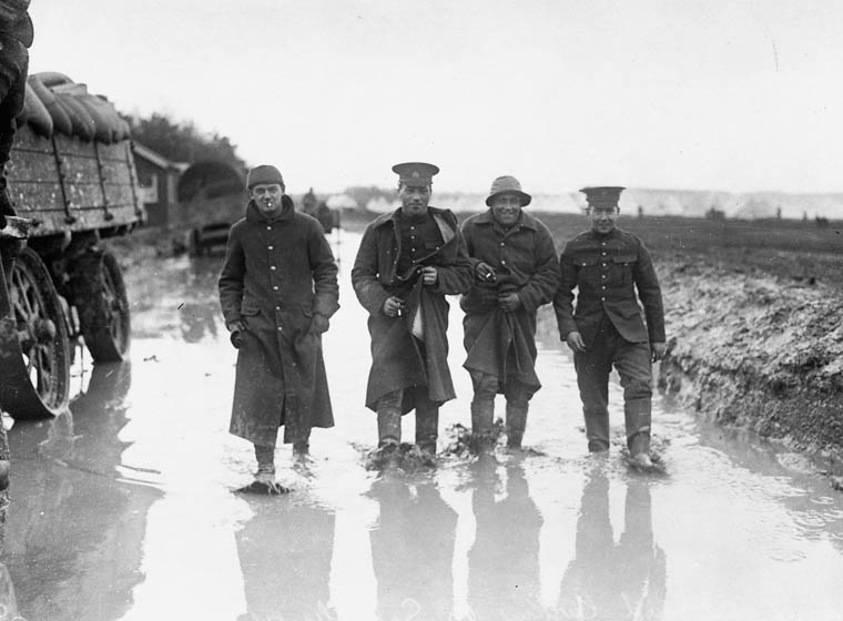 Cold high winds, saturated with moisture, accompanied the rain, and the Canadians, though accustomed to a severe climate, felt the cold of England as they never had before. Tents were blown down by hundreds in the gales and the discomforts sometimes became almost unbearable. The tents were wet all the time, the clothes and blankets of the men became water-soaked and remained so for long periods of time. There were no stoves or other facilities for drying purposes. But necessity is the mother of invention and the Canadian soldier soon learned that he could keep warm by the simple process of wrapping himself in wet blankets and steaming as he would in a turkish bath with himself as the heater. He also made the discovery that a pair of wet socks well wrung out and placed next to his chest at night would be almost dry in the morning.