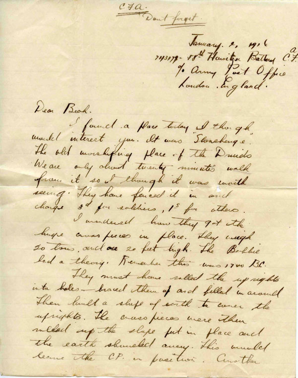 I found a place today I thought would interest you. It was “Stonehenge”. The old worshiping place of the Druids. We are only about twenty minutes walk from it so I thought it was worth seeing. They have fenced it in and charge 3d for soldiers, 1s for others.