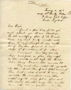 A letter written to his older sister Margaret (“Beah”) from Lark Hill Camp on January 2, 1917. Note: he dated his letter “1916” but this was a mistake as he was in the 115th Battalion (infantry) before transferring to the Artillery in November 1916.