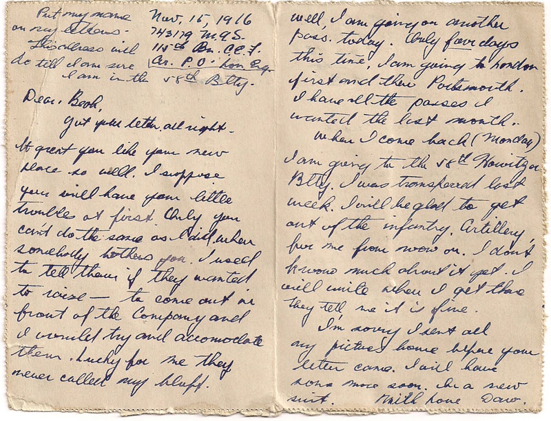 When I come back (Monday) I am going to the 58th Howitzer Btty. I was transferred last week. I will be glad to get out of the infantry. Artillery for me from now on. I don’t know much about it yet. I will write when I get there. They tell me it is fine.