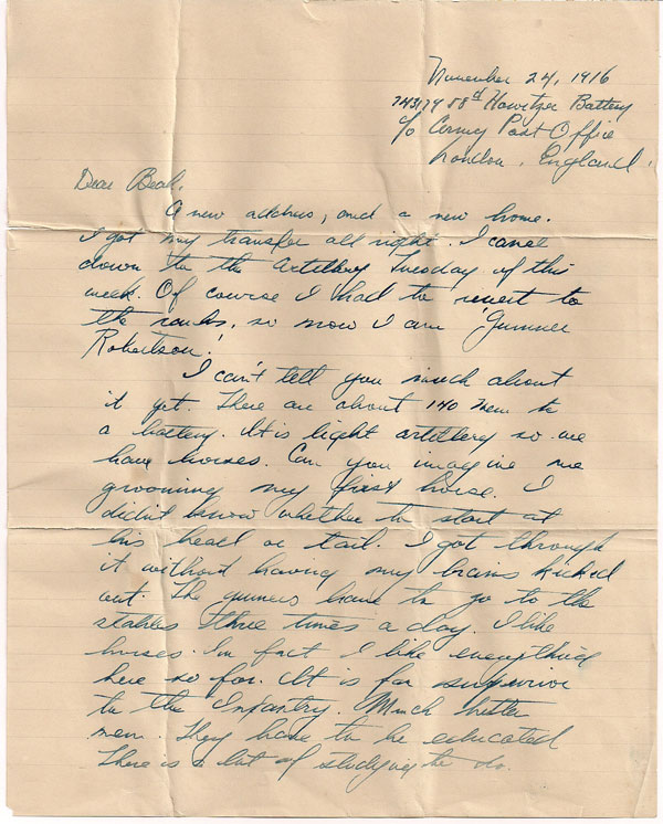 A new address, and a new home. I got my transfer all right. I came down to the Artillery Tuesday of this week. Of course I had to revert to the ranks, so now I am ‘Gunner Robertson.’