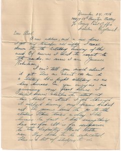 I was in London last week for four days. I only went to get away from camp. It was getting darn monotonous doing nothing. I think I am pretty lucky to get in the Artillery. The 58th is called the best Battery in Camp. You know I had some trouble with my left lamp. The Doc wouldn’t sign any transfer. I put up a kick and went to another one. He signed it. He didn’t examine me though. It is too bad I should have such a slight thing give me so much bother. I can see miles.