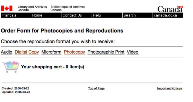 Step 6: Complete all the fields on the “Digital Copy” or “Photocopy” order form. I use the “Title/Description” field to indicate I’m ordering the complete service file for the soldier and include his name, rank and regimental #. Use the information from the “Item Display” screen to fill in the “Reference Number” field. If you’re ordering a digitized copy be sure to select “Colour” from the Colour drop-down.