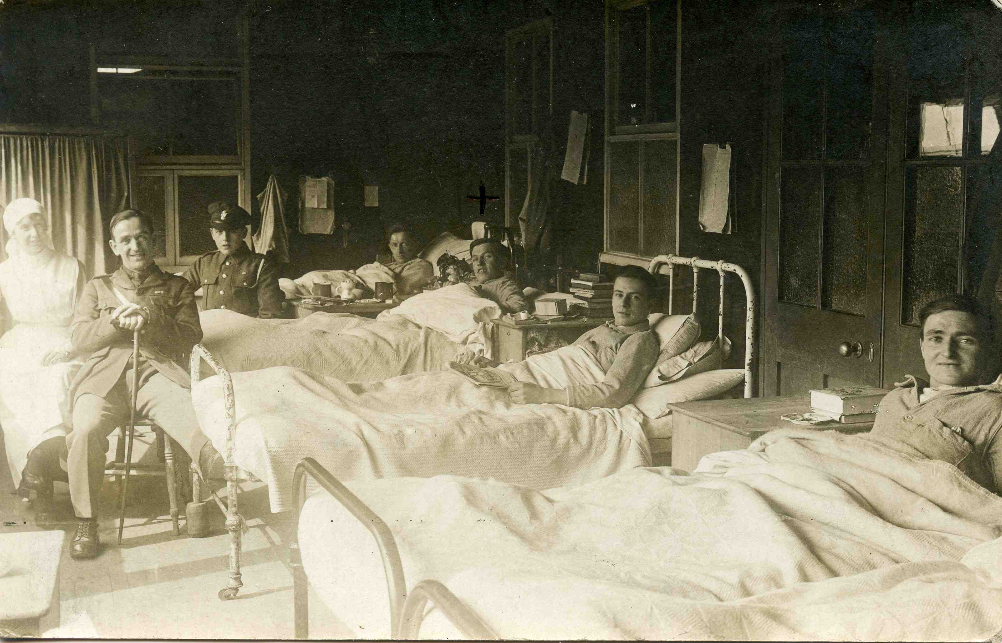 On my recent trip to the UK I picked up this small collection of real photo postcards showing soldiers recovering at British convalescent hospitals. The postcard pictured here, and one other, was taken at Beckett’s Park Hospital in Headingley (near Leeds). Three of the remaining four have small numeric notations similar to ones on the Beckett’s Park postcards but at this point I can’t confirm where they were photographed. One of my favourite images was taken at Christmas and you can clearly see the Christmas tree and the bottles of beer on the patients’ bedside tables. You can view all these images in my Convalescent Hospitals set on Flickr.