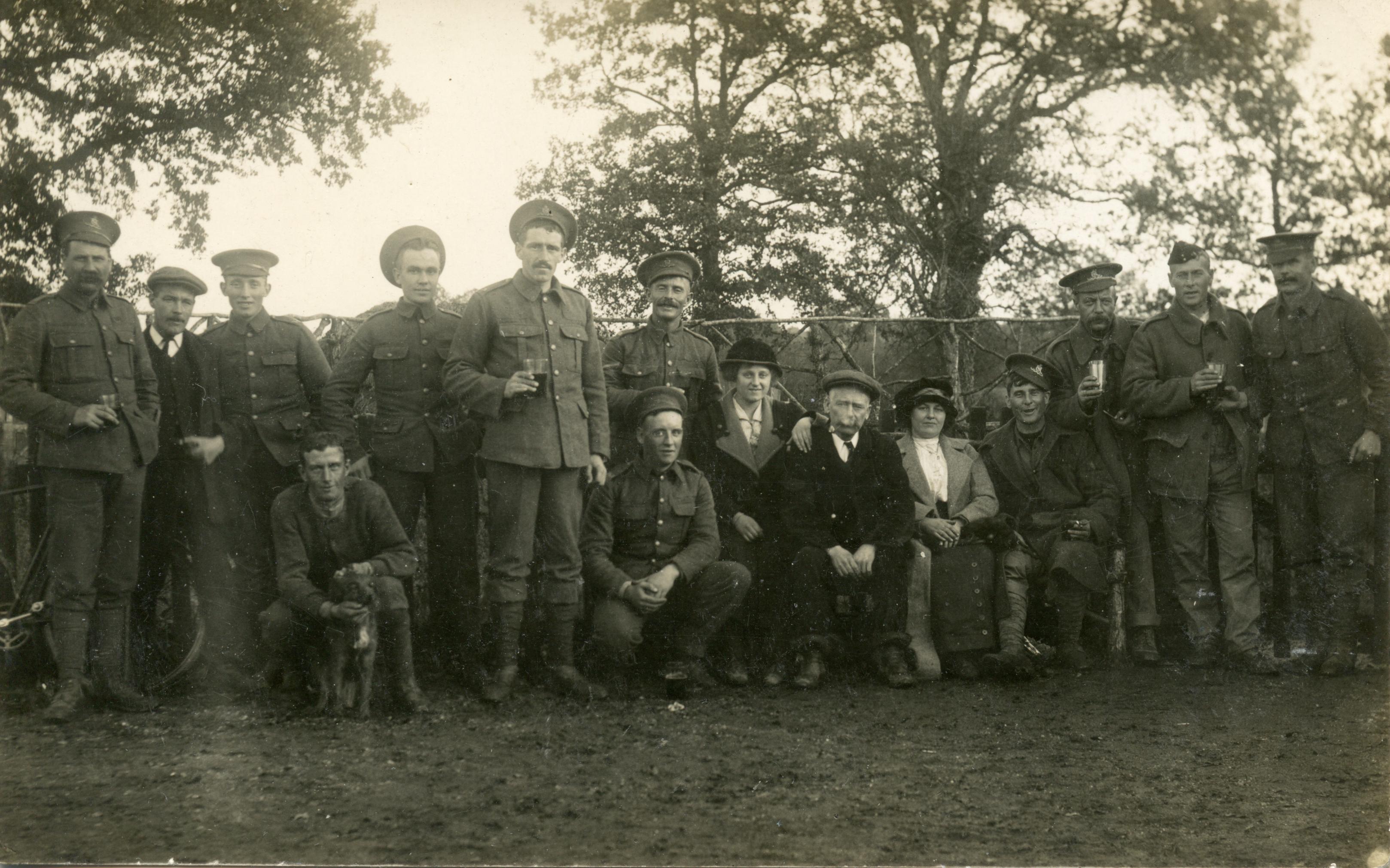 This set of three postcards may have been photographed in England prior to shipping out to France in December 1914. They are wonderful images, particularly the one showing the boys enjoying a pint with friends and family.