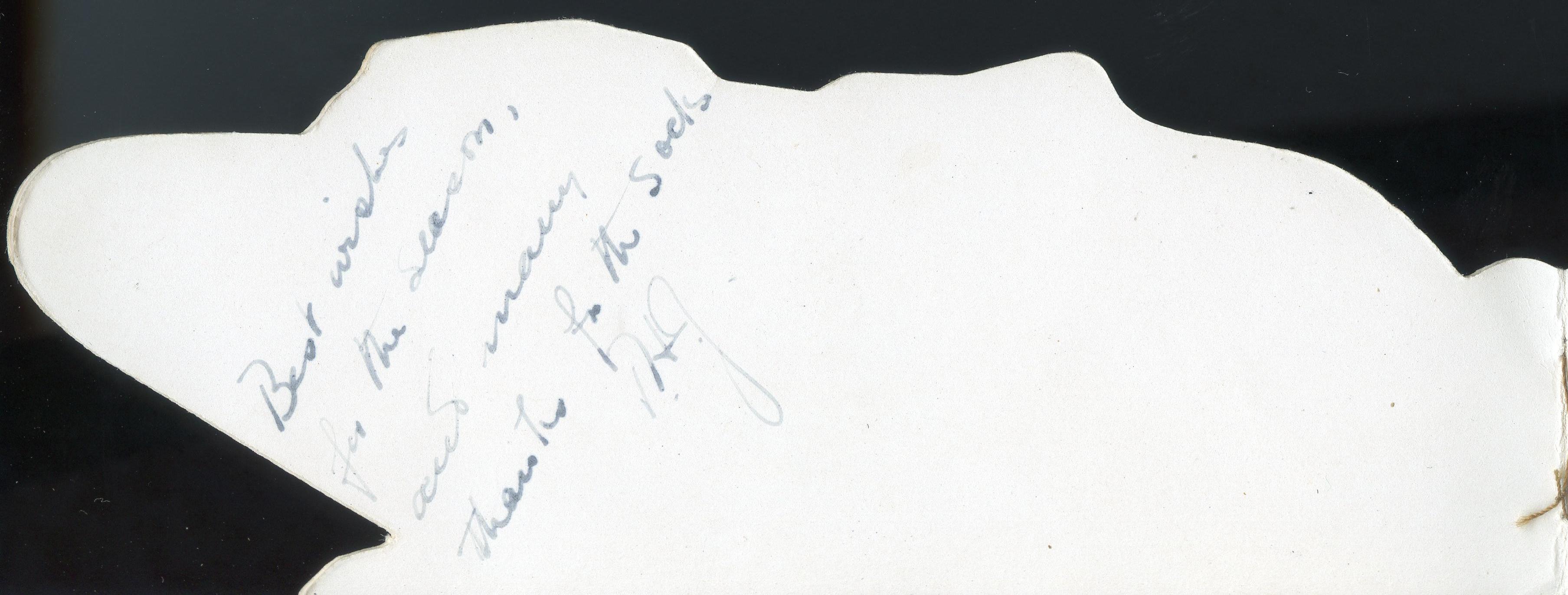 This wonderful die-cut 1918 Christmas card was sent by one of the 92 officers that made up the 1st Canadian Tank Battalion in 1918. The officer, whose initials were either “I.H.J.” or “V.H.J.”, extended his best wishes for the season and thanked the recipient for the socks.
