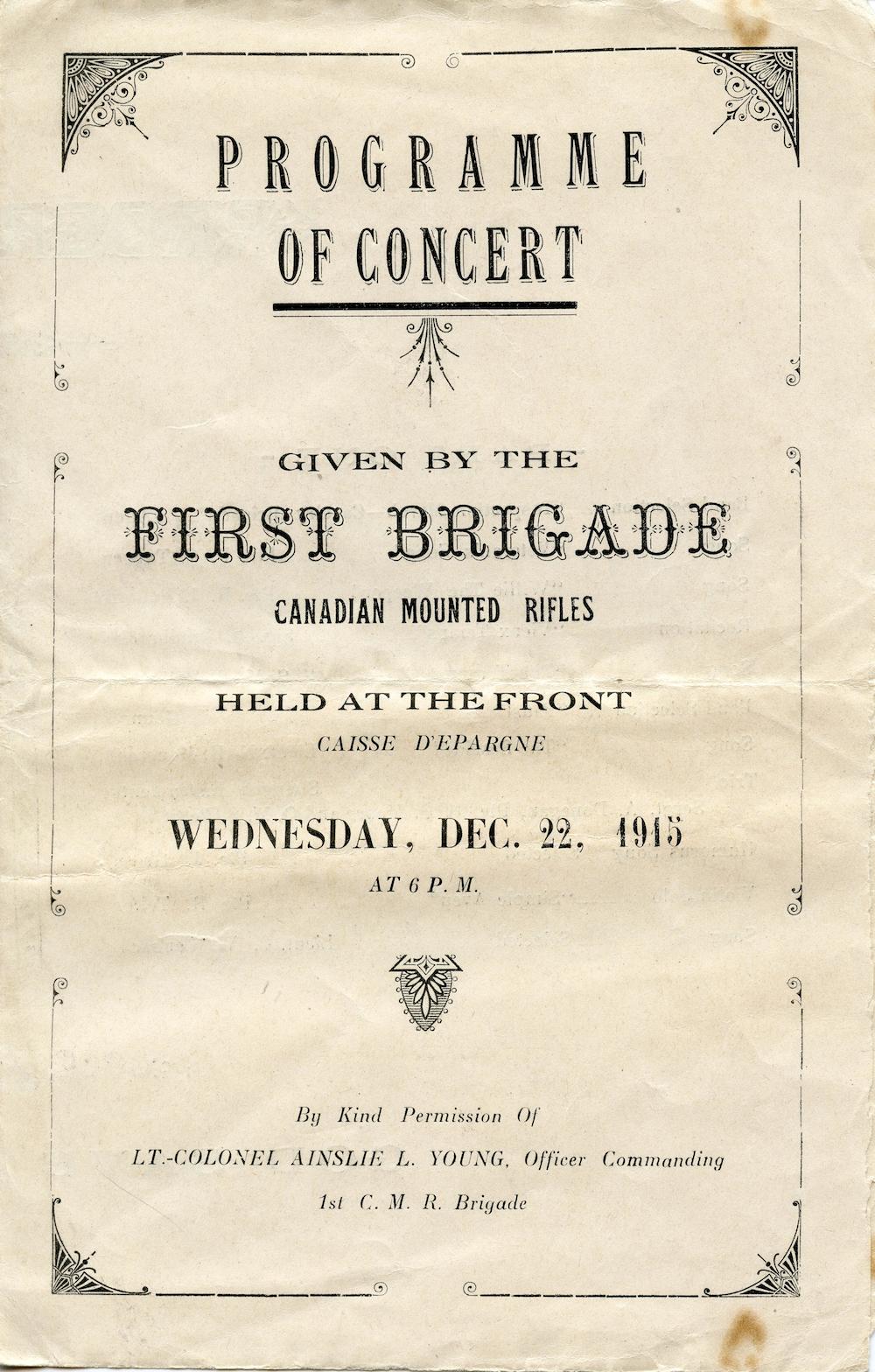 This well worn programme commemorates a concert held near the front lines just before Christmas 1915. It names 44 officers, NCOs and men from the First Brigade Canadian Mounted Rifles. The brigade landed in France on September 22, 1915 and was made up of the 1st Canadian Mounted Rifles raised in Brandon, Yorkton and Saskatoon; the 2nd Canadian Mounted Rifles raised in Victoria, BC; and the 3rd Canadian Mounted Rifles raised in Edmonton and Medicine Hat.