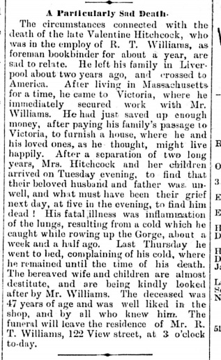 The Hitchcock family arrived in Boston eleven days later but did not make the journey to Victoria until the following spring, arriving on April 14, 1891. What should have been a joyous reunion quickly turned tragic when the elder Valentine, aged only 47, died of complications from a cold the following day!