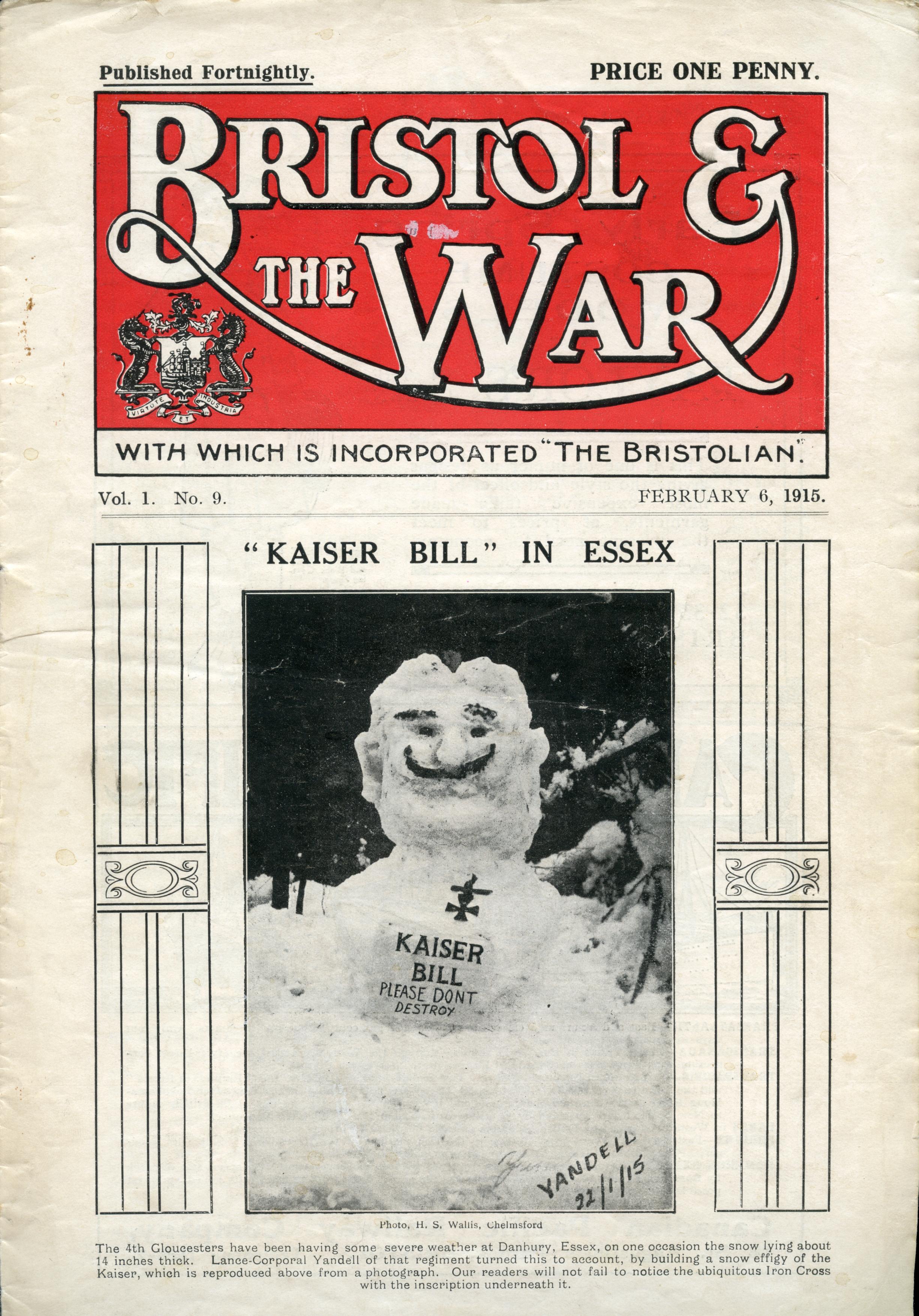 Vol. 1 No. 9 of “Bristol & the War”, the third issue which I’ve scanned and uploaded to Flickr, features a great cover photo of a snowman in Essex named “Kaiser Bill”. The magazine includes a review of Mr. Hilaire Belloc’s war lectures in Bristol, a long article on the Cossham Memorial Hospital, and a number of photographs of various regiments in and around Bristol. The Bristolians on Active Service section lists a number of individual soldiers, some of whom are pictured as well. Those mentioned are: