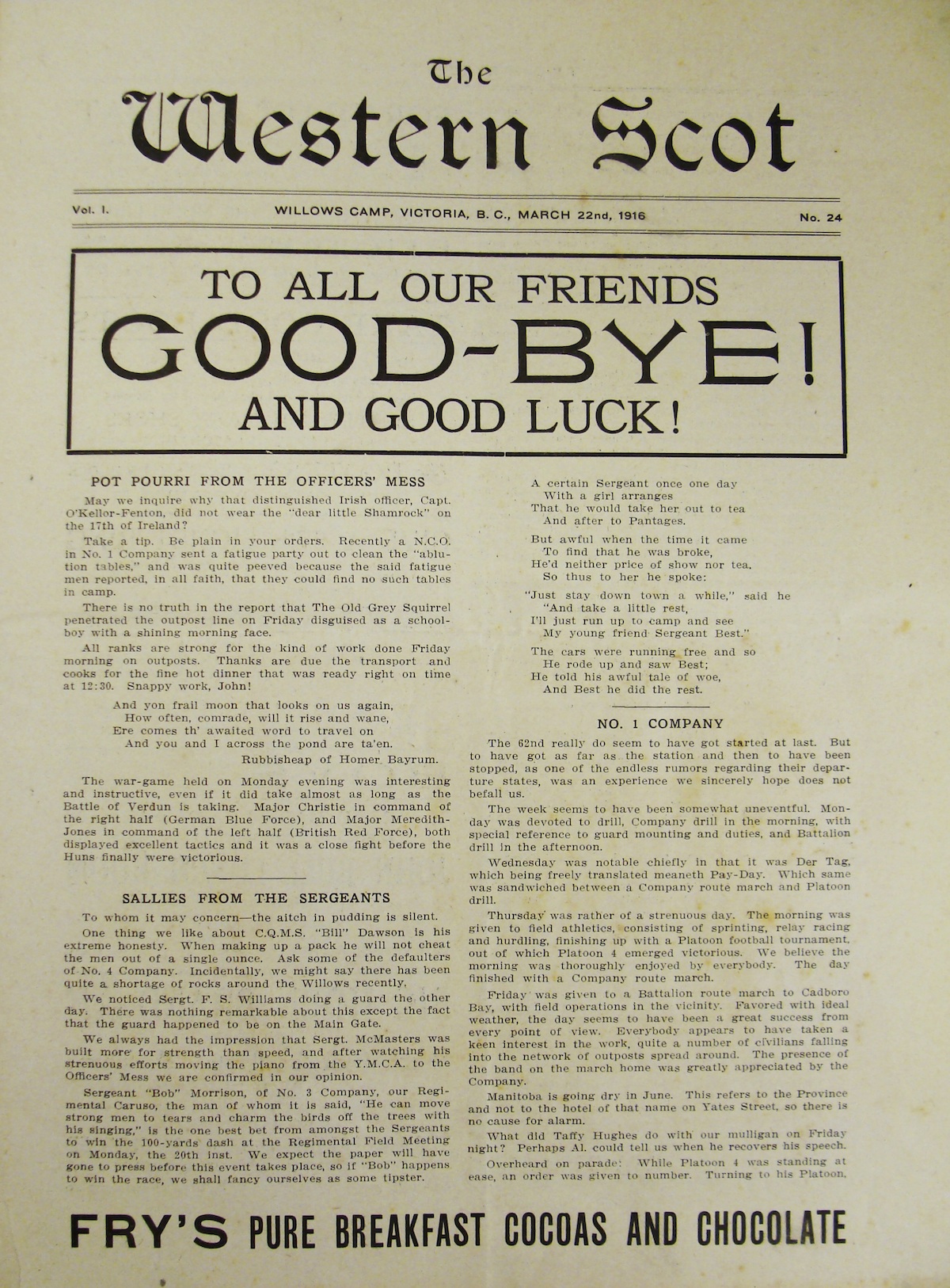 By the end of February the battalion had been training at Willows Camp for nearly six months and were anxiously awaiting their orders to head overseas. The Western Scot Farewell Edition was published on February 23rd and Major Harbottle provided this advice on their departure: