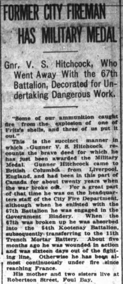 Pte. Hitchcock rendered valuable assistance in removing ammunition from the recess, and in extinguishing the fire, which had ignited the sandbag curtain and framework of the recess. He afterwards carried a number of shells which had become hot to the lip of the crater to cool off. His coolness and bravery undoubtedly assisted in preventing the destruction of the whole of the ammunition and the guns, with a possible loss of life.