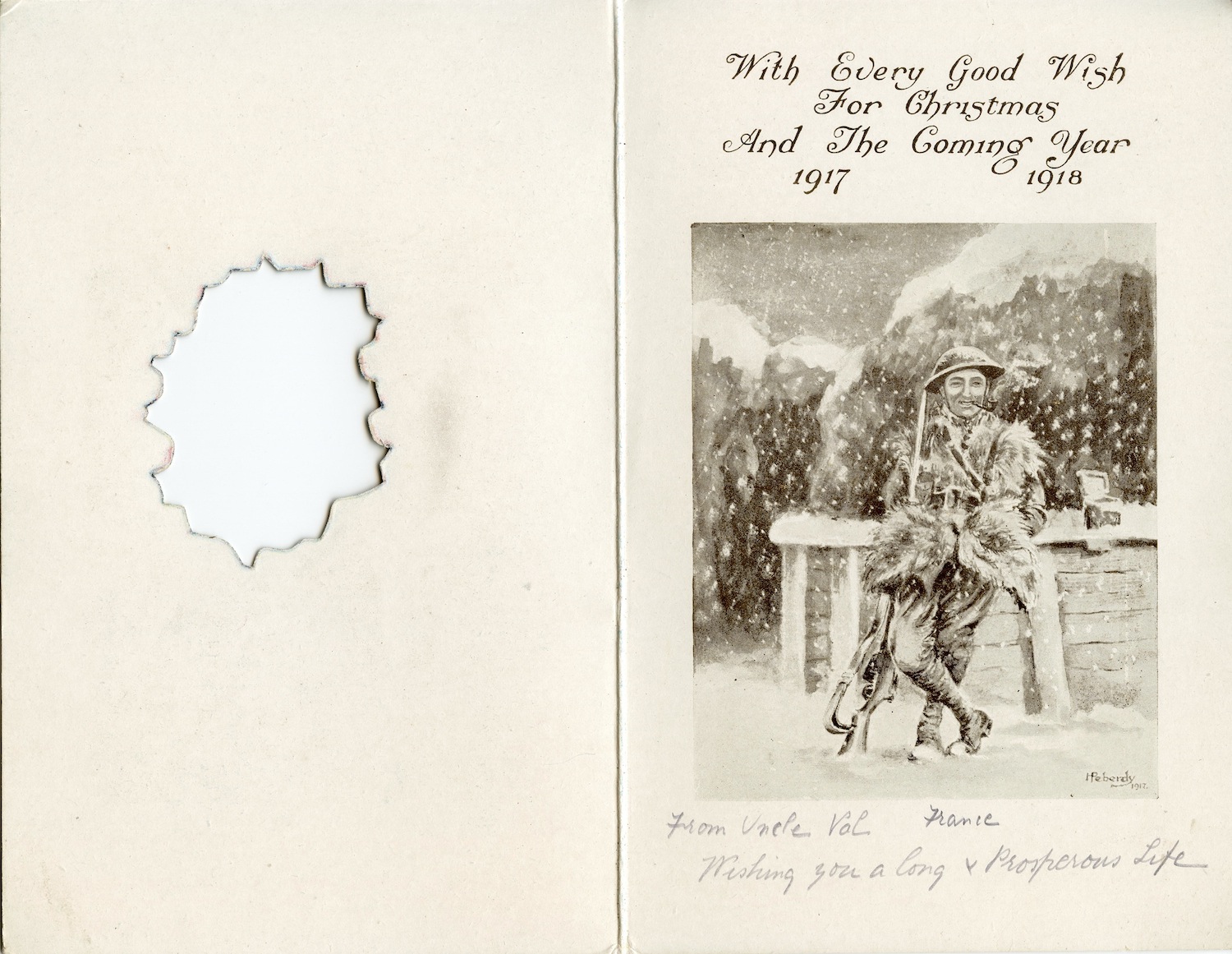 On Nov. 18th the 11th Brigade was relieved by British 33rd Division and marched out of the Salient and towards Ourton in France. On the 24th Valentine was granted 14 days leave, his first since arriving in France in August of 1916. There’s no record of where he went or who he visited, only confirmation that he rejoined his unit in Ourton on December 15th. Perhaps it was during his leave that he posted this wonderful Christmas card to his one year-old niece, also named Valentine, back home in Victoria, B.C.. The card read “From Uncle Val (France) Wishing you a long & prosperous life”. On Dec. 20th the 11th Brigade relieved the 5th & 6th Brigades and as a result Valentine spent Christmas in the front-line trenches in the Mericourt sector on the edge of Lens.