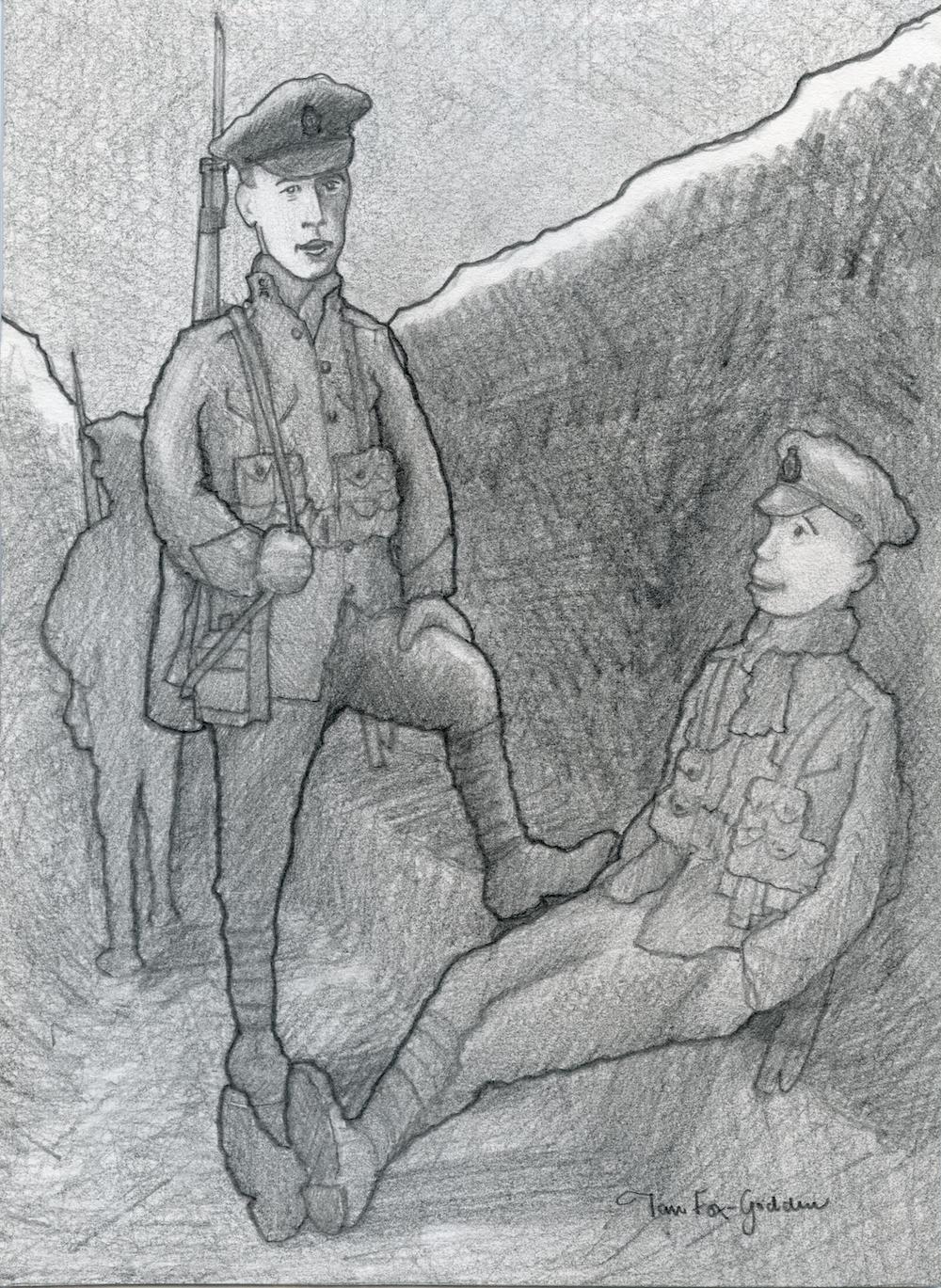 I’ve been searching for a photo of Herbert in uniform for many many years but I’ve had no luck. I’m a great admirer of Tim Fox-Godden‘s drawings and an avid follower of his illustrating the Great War blog. So much so that I recently commissioned him to draw Herbert for me. Within the space of a couple of weeks I received both a preliminary sketch (above) and a larger drawing of Herbert in a trench (below). Tim’s done a wonderful job and I’m very much looking forward to hanging both pieces on the wall next to my desk. I confess I’ve purchased a third drawing and may need more wall space before long!