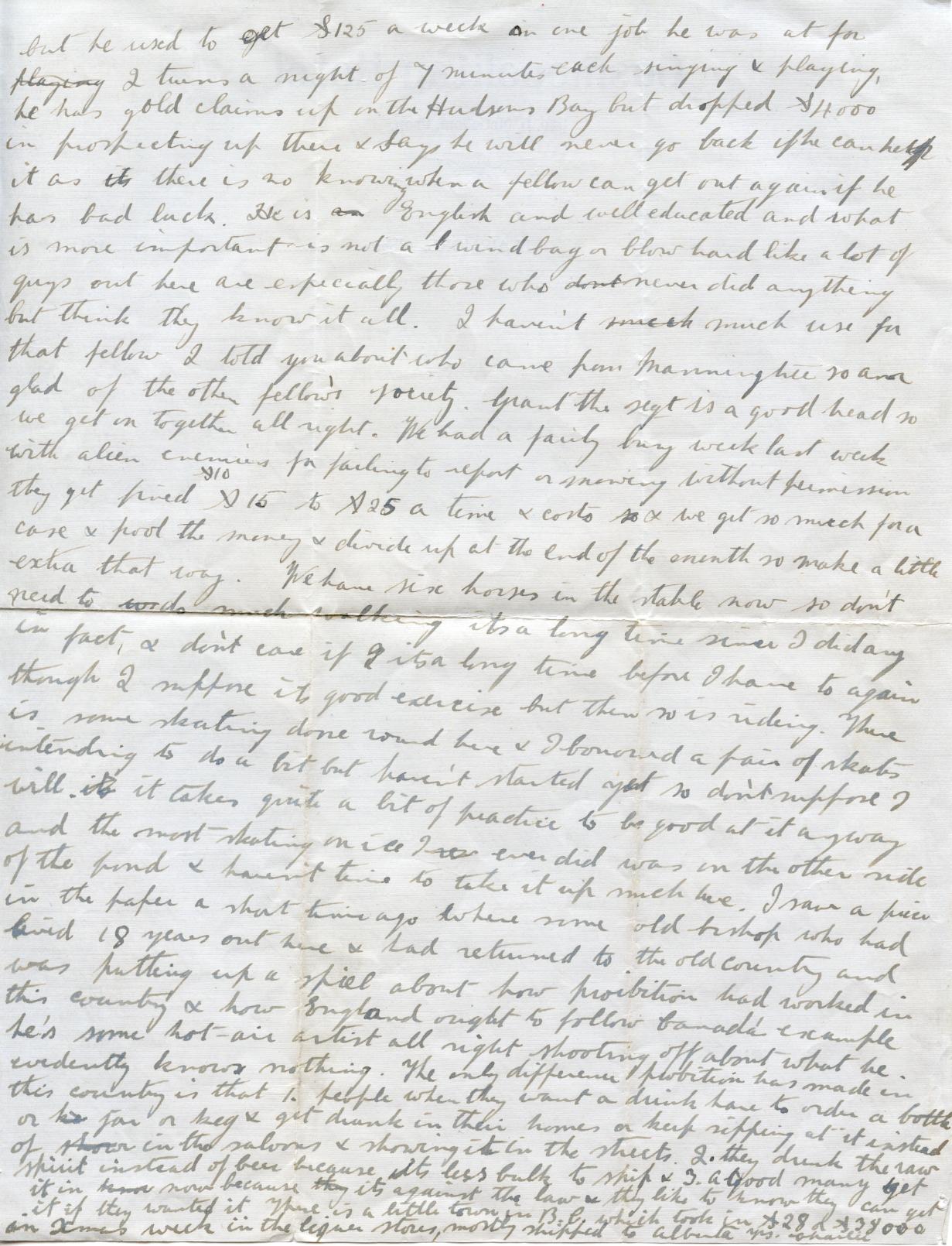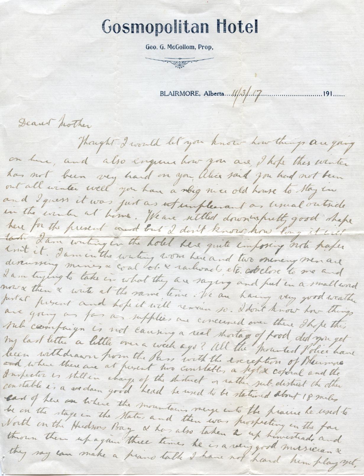 I recently obtained a letter written by a Constable in the Royal North-West Mounted Police, stationed in Blairmore Alberta in early 1917. The letter to his mother touches on a number of subjects and included a statement that implied that rounding up enemy aliens was a profitable venture: