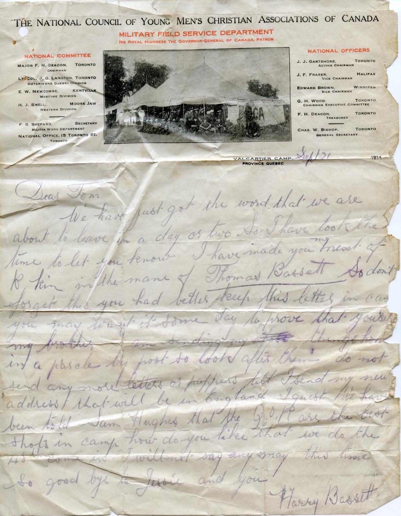 On September 21, 1914 Harry wrote to his brother Thomas in Toronto from Valcartier camp, the day before he signed his attestation papers, to inform him that he was making him his “next of kin”. Harry was assigned service number 9298 and became a member of the 3rd Battalion (Toronto Regiment) CEF, a battalion largely made up of recruits from the Queen’s Own Rifles. In the letter Harry boasts that Sam Hughes, the Canadian Minister of Militia and Defence, felt the Queen’s Own Rifles were the best shot in camp, a fact which the 48th Highlanders, another Toronto-based Militia unit may have taken issue with.