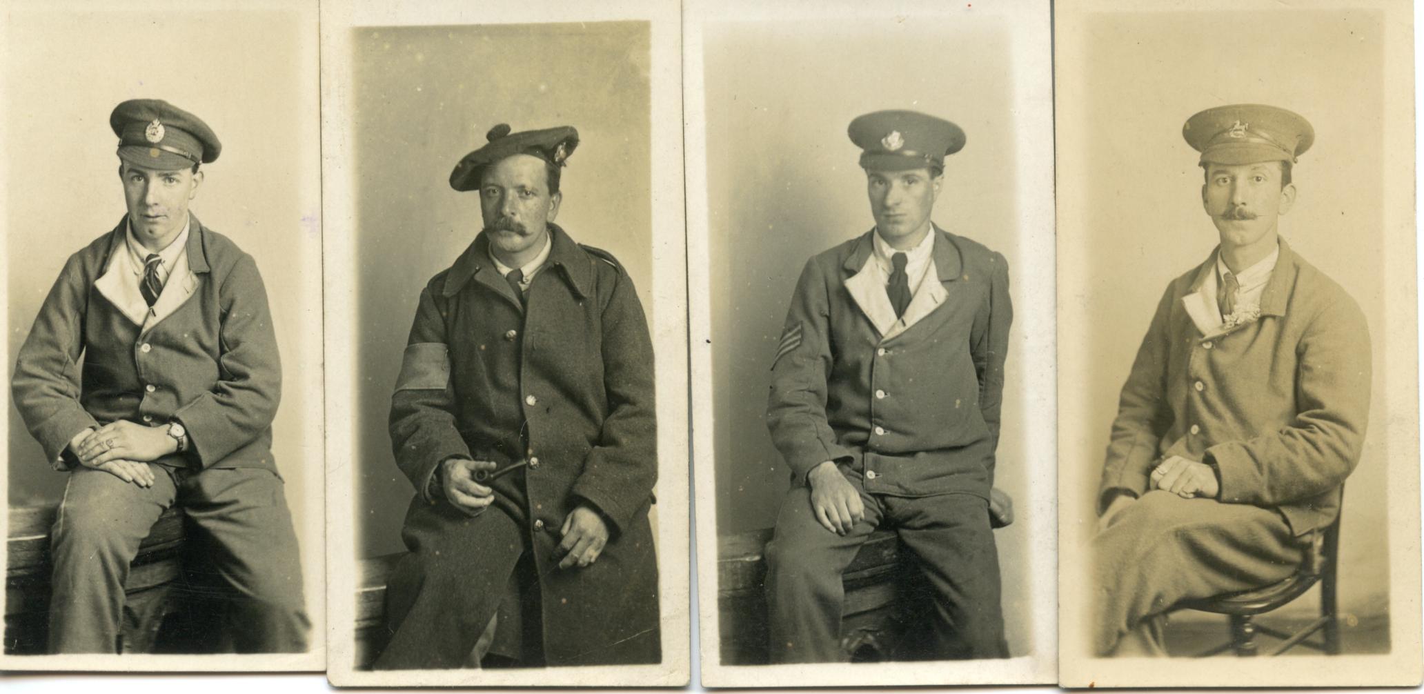 I’ve sifted through hundreds, if not thousands, of First World War studio portraits but these are unusual in that they measure a mere 1 3/4″ x 3 3/8″. They are printed on postcard stock and are of excellent quality. The photographer was Malcolm Macalpine whose black & white studio was located at 26 Greenside Place in Edinburgh however the backs are stamped indicating they were snapped at their studio in Waverley Market, located next to the train station, and all between August and October 1917. Unfortunately I have no information on the four convalescing soldiers.