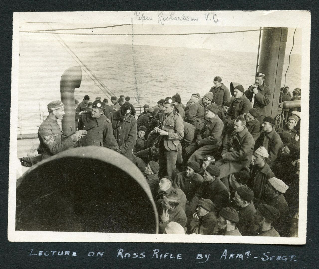 The third photograph shows the Armoury Sergeant, who I believe to be Perey B. Gibson, lecturing the troops on the Ross Rifle. Looking on from the crowd is a very young Piper James Richardson who would earn the Victoria Cross but lose his life in October 1916. To my knowledge this photograph has never been published before today.