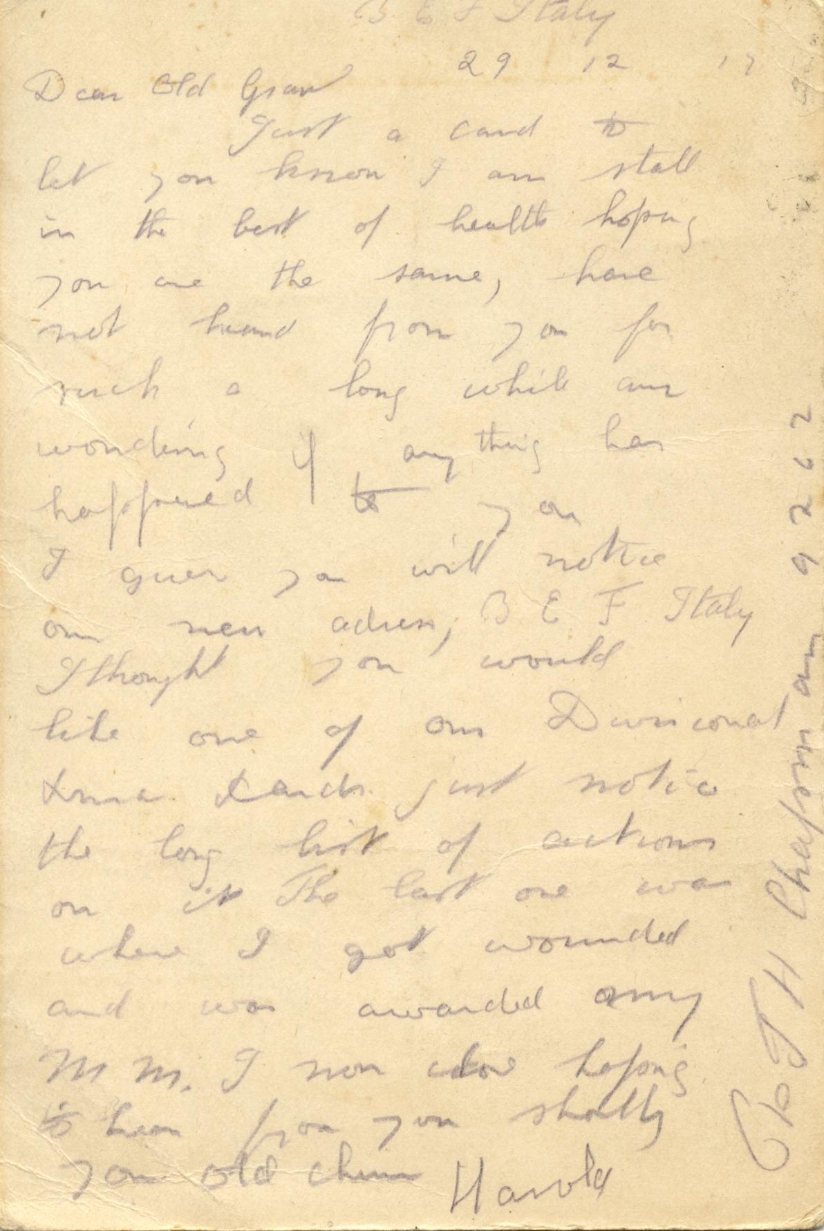 Each postcard lists the 7th Division’s Battle Honours for the year and young Thomas Harold Chapman drew his grandmother’s attention to the last entry for 1917, Passchendaele Ridge, “where I got wounded and was awarded my MM.”. The card is dated December 29, 1917 and was written from Italy where the 7th Division had recently moved in order to support the Italian war effort after that country’s enormous losses at the Battle of Caporetto.