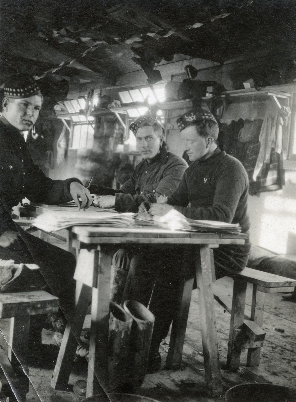 This wonderful photograph from the John Denholm scrapbook shows three members of the 16th Battalion (Canadian Scottish) checking attestation papers in a Lark Hill hut sometime in January 1915. Judging from the decorations festooned from the ceiling this may have been early in the new year.