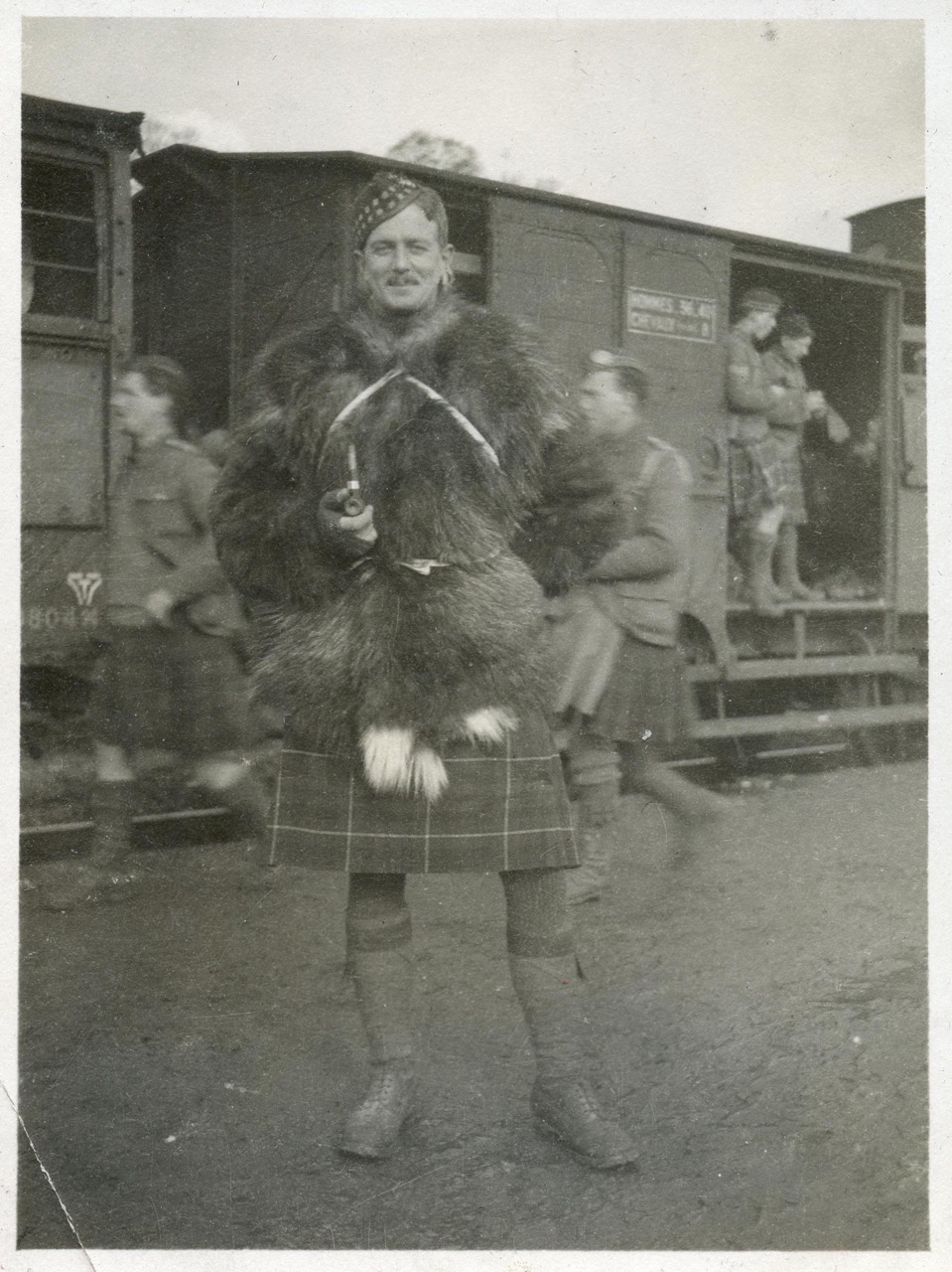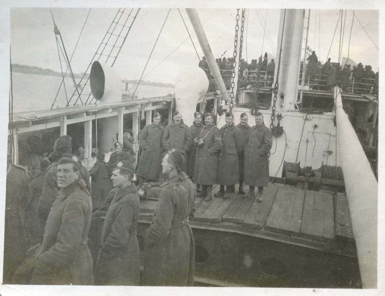 “The evening was still and spring-like; the full Pipe Band assembled on the upper deck and played marches and reels; groups of French people in their Sunday attire could be seen standing beside the white houses and walking along the roads bordering the trim, cultivated fields, gazing curiously seawards, whilst the troops, entirely recovered from their misery of yesterday, crowded every available space on deck and gazed just as intently on the pleasant landscape of the long-looked-for France.”
