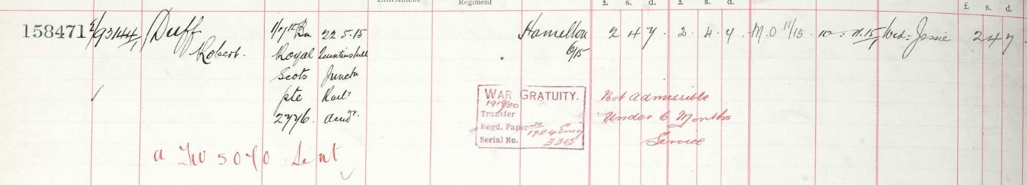 To add insult to injury, after the war George’s widow Helen received a £3 War Gratuity payment but Robert’s widow Jesse did not. George had just over 6 months and two weeks of service but younger brother Robert’s claim was, as recorded in the Soldiers’ Effects Register, “Not Admissible Under 6 Months Service“.