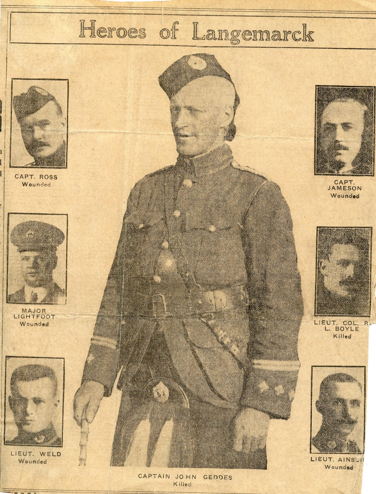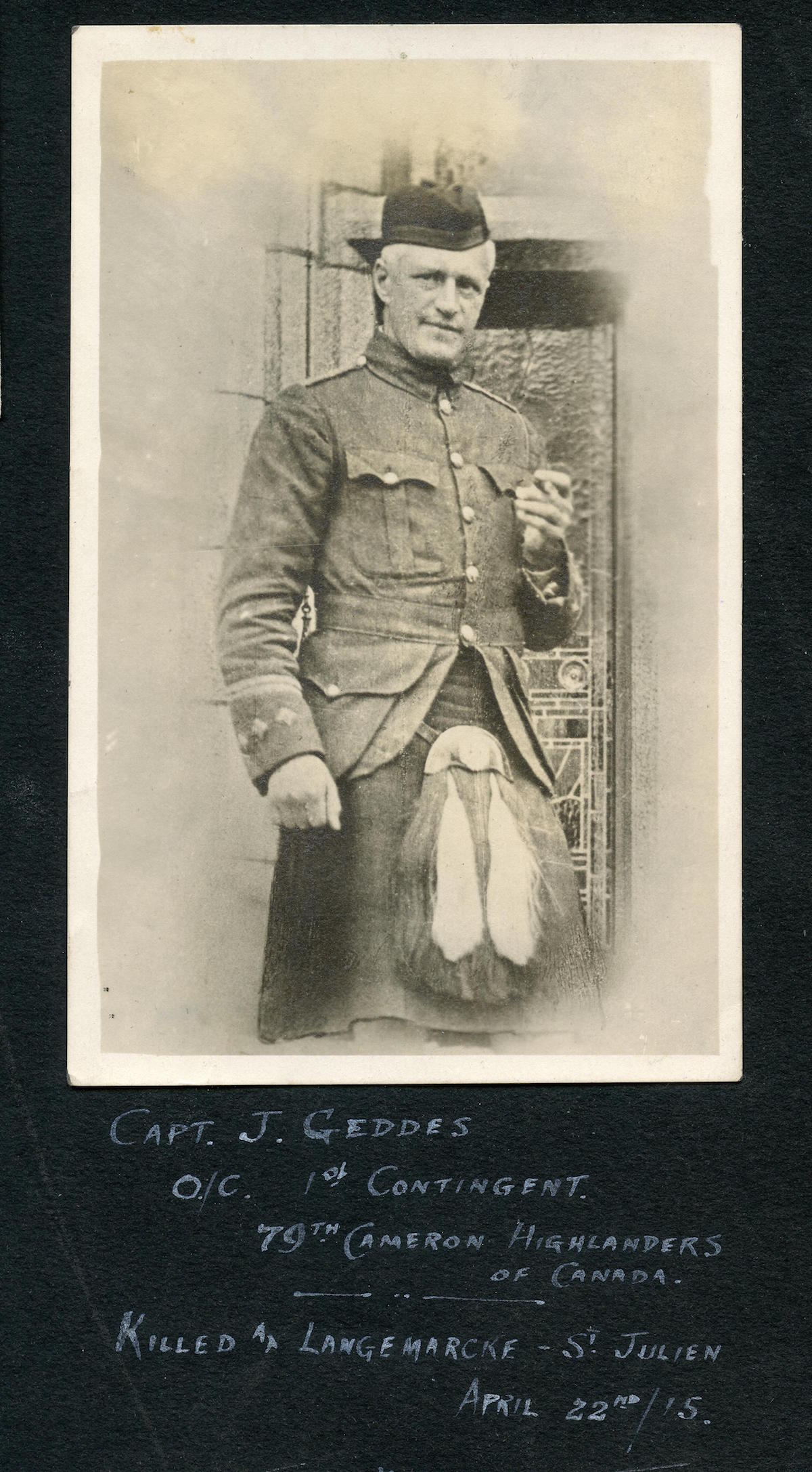 The 36-year old Geddes was born in Chicago in 1876 to Scottish parents and educated in England. He emigrated to Canada in 1903 and joined the 79th Cameron Highlanders of Canada at its inception in 1910. He was promoted to Captain two years later and was given command of No. 4 Company in the newly formed 16th Battalion. Geddes led his Camerons from the day they left Winnipeg in August 1914 to their bayonet charge on the first day of Second Ypres.