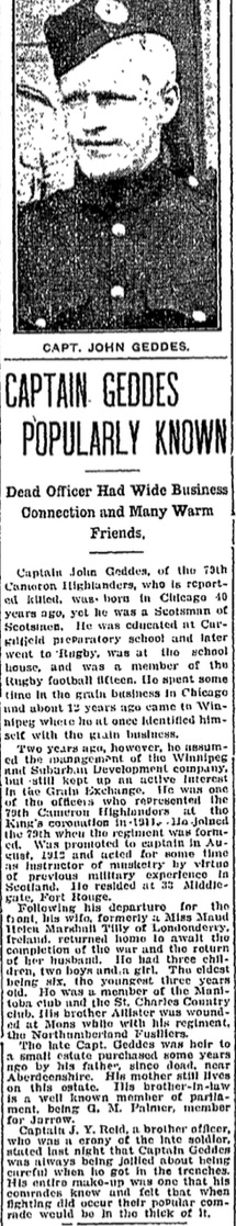 The body of John Geddes was never recovered and so he is commemorated on the Menin Gate in Ypres. Captain Geddes left behind a wife and three children in Winnipeg. A BBC news article reported last year that among his descendants is a great-great nephew who is both a Cameron and the British Prime Minister.