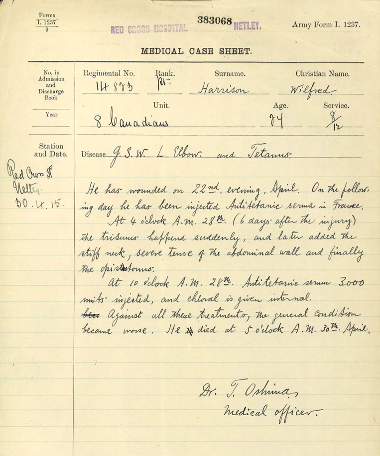 Tetanus is a bacterial infection commonly found in soil and a wounded soldier would be particularly susceptible to infection. The symptoms include violent muscle spasms which can sometimes lead to bone fractures or muscle tears. On April 28th Dr Oshima reported that Wilfred began showing signs of tetanus including a stiff neck, severe tensing of the abdominal muscle and opisthotonos (arching of the back). Despite their best efforts his condition only worsened and at 5am on April 30th 1915 Wilfred Harrison passed away.
