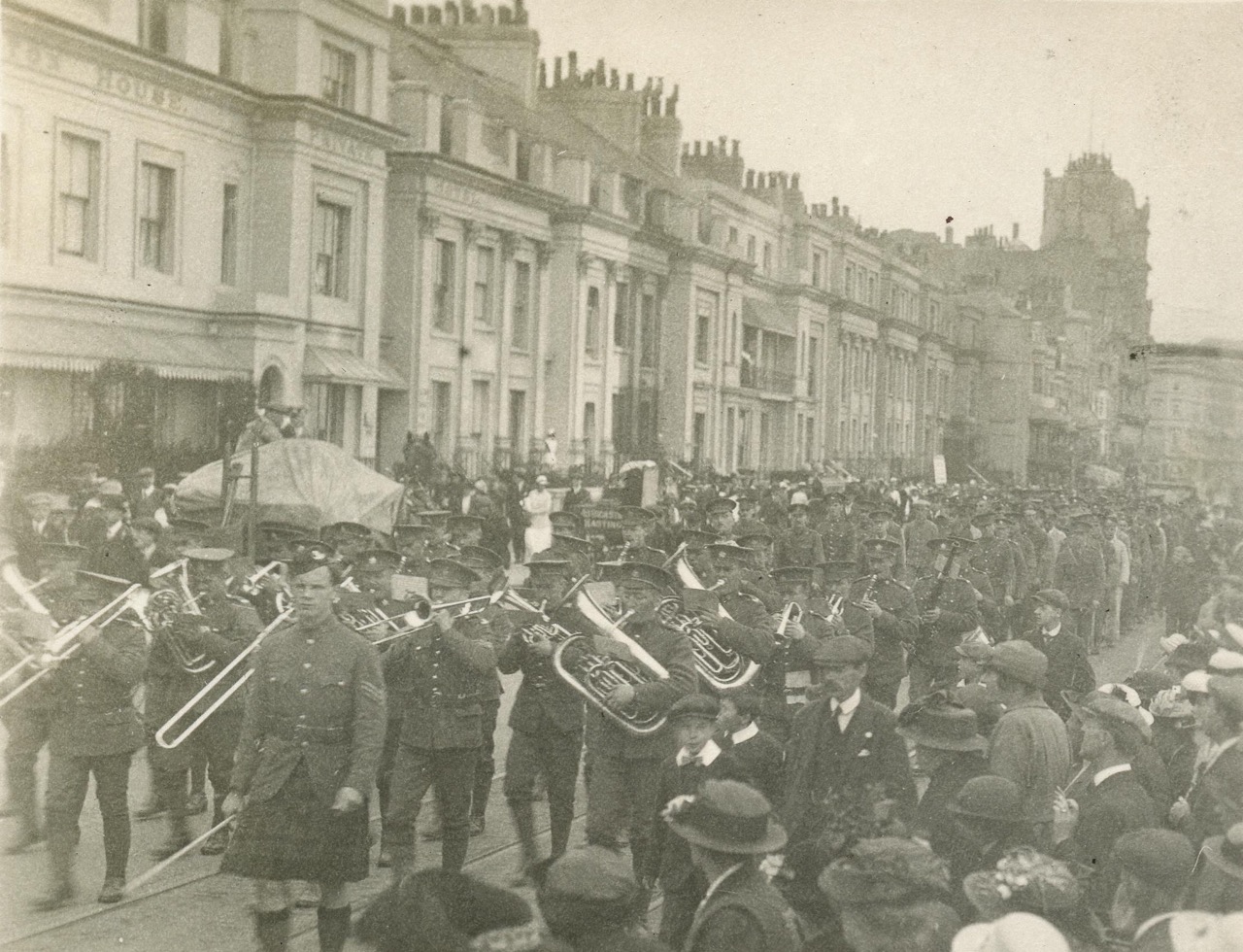 Published May 16, 2015 at 1280 × 980 in Who Goes There? 158th Battalion Regimental Band‘HastingsWhitMonday1917-4’ 9th Battalion Band parading through Hastings in 1917 ‹ Back