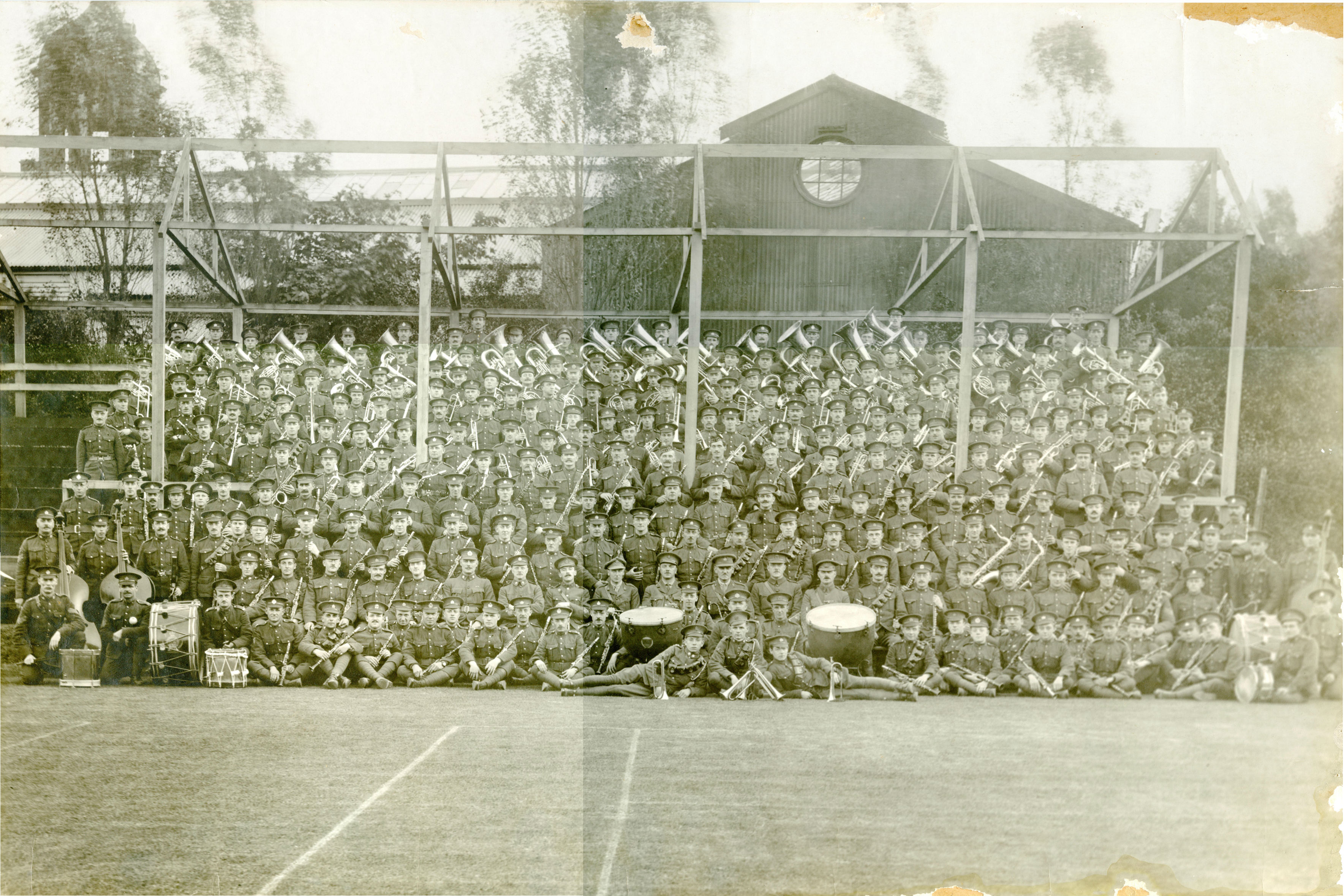 I recently acquired this 14″ x 21″ First World War photograph of massed Regimental Bands. It was scanned in four pieces and stitched together so I apologize for the patchwork nature of the image. It is nonetheless an interesting image to examine.
