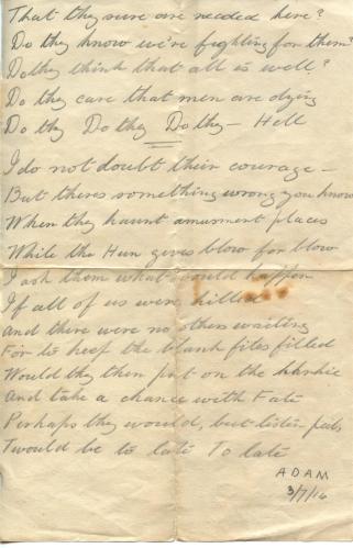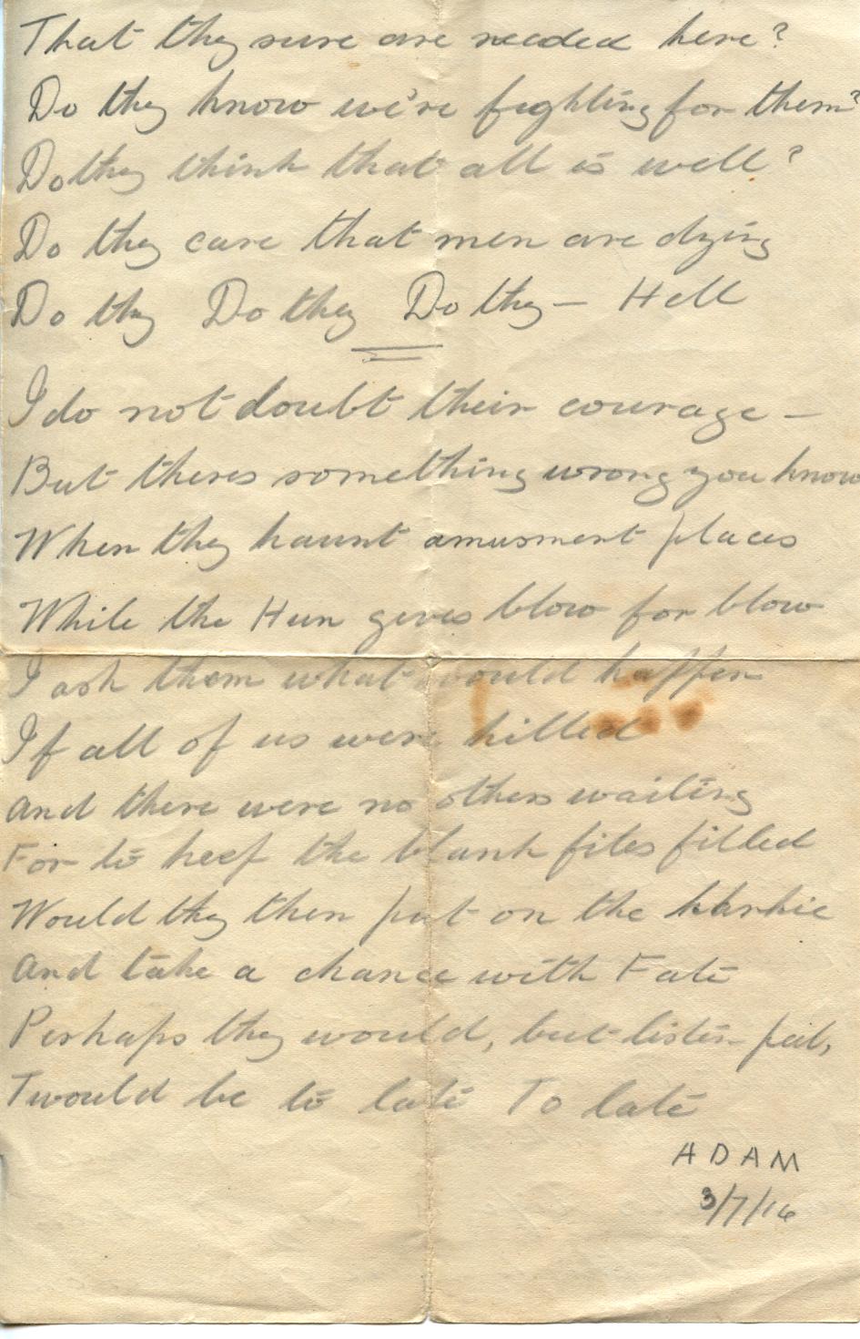 Published August 3, 2015 at 945 × 1470 in Who Goes There? Unknown Trench Poet pens “O Canada!”‘PoetryOCanada004’ O Canada! by “Adams” dated July 3, 1916 page 2 ‹ Back