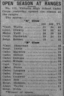 After leaving school Eustace joined the 72nd Seaforth Highlanders’ Cadets and by January 1913 was the “A” Company Cadet Leader. That same year his family moved to Victoria where Eustace enrolled in Victoria College, an extension of Victoria High School which offered first and second year courses at Montreal’s McGill University. In November Company Leader Shearman of the 72nd Seaforth Highlanders’ Cadets was attached to the Victoria High School’s No. 112 Cadet Battalion for the year and given command of “B” Company. In April 1914 the British Colonist newspaper reported that Eustace had won the “B” Class shooting competition.