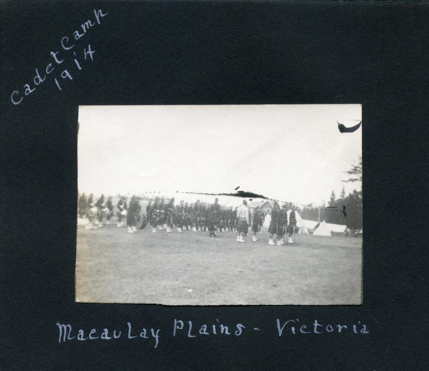 An album he compiled during that period also included two photographs taken at the 1914 cadet camp on Macaulay Plains in Victoria. The camp took place between July 6 and 11 and was attended by 800 cadets from Vancouver and Vancouver Island. The Victoria High School Cadets did not attend but Eustace must have rejoined the 72nd Seaforth Highlanders’ cadets who were there in numbers. The camp commandant was Lt-Col. Leckie who within months would assume command of the 16th Battalion (The Canadian Scottish). For more information on the cadet camp I highly recommend you visit History of Work Point Barracks by Jack Bates, a fantastic resource for researchers.