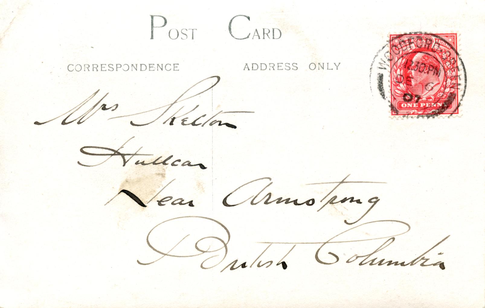 The postcard was sent by Mary and Benjamin Skelton of Woodford in Essex to Frances, the wife of Richard Skelton (Benjamin’s brother) in Armstrong, BC. The postmark shows it was posted from Woodford Green in Essex on December 6, 1907. At that time Henry Skelton, the eldest, was 10 years old while his younger brother Benjamin was 7. Richard was 4 and the youngest, Anthony, was just one year old. The Skelton’s only daughter, Myria, died in 1902 aged two. Richard and Frances emigrated to Canada in 1907 and this postcard of their nephews was likely sent just in time for Christmas.