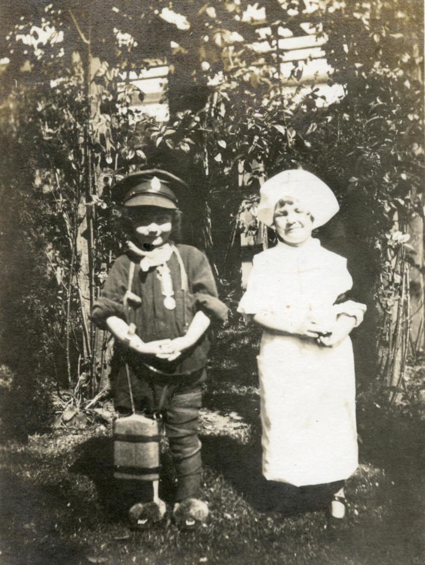 Although there’s no record of young Valentine receiving a dog we do have this wonderful photo of her with a friend taken shortly after the war. In it she proudly wears her Uncle’s service dress cap (featuring a 11th Canadian Light Trench Mortar Battery cap badge), his military medal, water bottle, puttees and standard-issue fuzzy slippers.