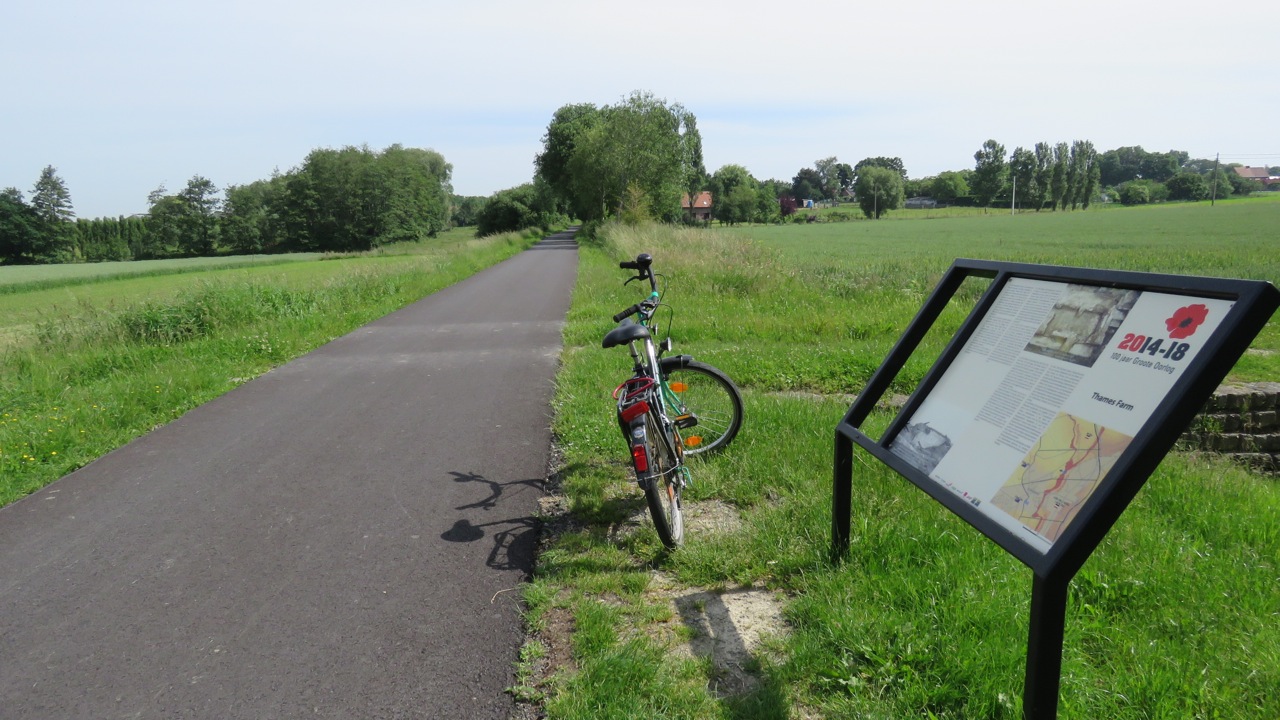 On day two I borrowed a bike from my b&b and set out on a 45km circuit known as the Vredes Fietsroute. Now I’m a walker and not a cyclist so this was a great opportunity to see Flanders and to discover muscles I never knew I had. Joking aside it was a great route and I was able to visit eight cemeteries along the way, including Polygon Wood, Tyne Cot, Maple Copse and the German War Cemetery at Langemark. I modified the route slightly to include a visit to Passchendaele, where I ate a picnic lunch on the lawn of the Canadian memorial, and Poelcapelle. By the time I rejoined the Menin Road nine hours later I was well and truly spent. As luck would have it there was a Frieten (chip) shop right on the corner and so I ate my dinner on a picnic table by the side of the road. As I stood up to leave I realized I had been eating next to Birr Cross Roads Cemetery and so there would be one more stop before I called it a day.