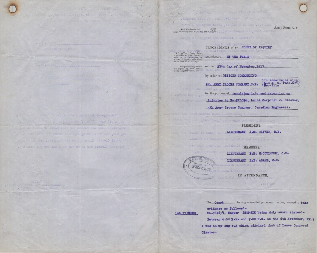 Published November 8, 2016 at 1063 × 849 in Dugout fire claims the life of L/Cpl Josiah Cleator, C.E. Court of Inquiry page 1. Source: Library & Archives Canada ‹ Back