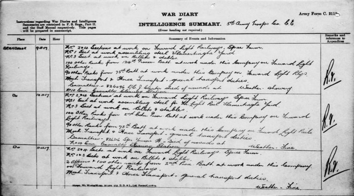 Published November 8, 2016 at 1179 × 655 in Dugout fire claims the life of L/Cpl Josiah Cleator, C.E. 5th Army Troop, C.E. War Diary excerpt. Source: Library & Archives Canada ‹ Back