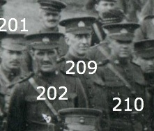 #209 – Capt. (Chaplain) Frederick G. Scott. Scott enlisted with the Canadian Chaplain Service at Valcartier and was initially attached to the 14th Battalion (Royal Montreal Regiment). He later became Senior Chaplain in the 1st Canadian Division and rose to the rank of Hon. Lt-Colonel. He was wounded by shrapnel at Cambrai in September 1918. In his post-war book, “The Great War As I Saw It” he described his appearance at Valcartier: “I was clad in a private’s uniform, which was handed out to me out of a box in the drill-shed the night before the 8th Royal Rifles left Quebec, and I was most punctilious in the matter of saluting General Hughes whenever we chanced to meet.” This description fits the officer labelled #209.
