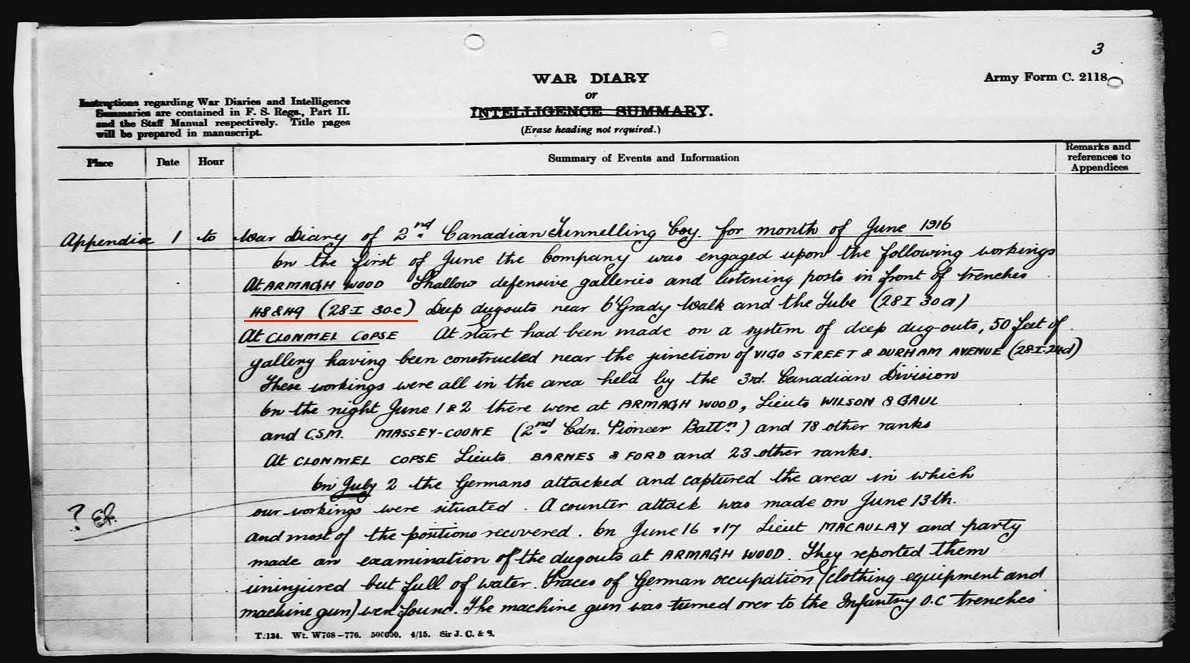 As the War Diary entry in Figure 1 shows the 2nd Canadian Tunnelling Company were working on shallow defensive galleries and listening posts in front of trenches H8 and H9 (28 I 30c) in the region of Armagh Wood. This grid reference breaks down as follows: