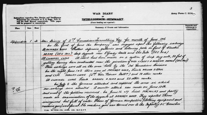References to map coordinates can be found in wide range of research documents including War Diaries and soldier Casualty Forms. The example in Figure 1 is from the 2nd Canadian Tunnelling Company War Diary for June 1916 and shows that the unit was at work on a variety of defences including “shallow defensive galleries and listening posts in front of trenches H8 & H9 (28I 30c)“.