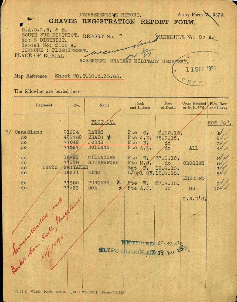 On September 25, 1915 Pte Fredrick Clifford John of the 7th Battalion CEF was killed, likely the result of retaliatory shelling caused by an earlier attack on German positions near La Petite Douve Farm just north of Ploegsteert. His casualty form (Figure 2) shows he was buried the same day by Chaplain Moffitt at reference “Sheet No 28 Square T.18.d”. In 1930 his remains were exhumed and reburied in the Berks Cemetery Extension and the Concentration of Graves (Exhumation and Reburials) report (Figure 3) includes a more detailed map reference: 28.T.18.d.35.65 referring to an area of 5 yards x 5 yards. It breaks down as follows: