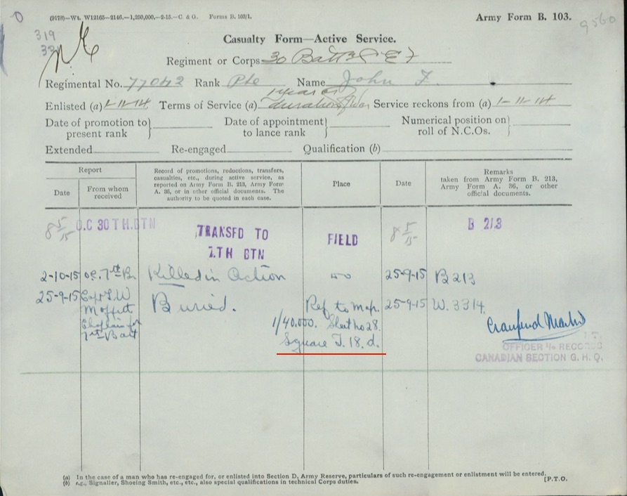 Although less common a soldier’s Casualty Form might also include a map reference. Frederick Clifford John of the 7th Battalion CEF was killed on September 25, 1915, likely the result of retaliatory shelling caused by an earlier attack on German positions near La Petite Douve Farm just north of Ploegsteert. His casualty form (Figure 2) shows he was buried the same day by Chaplain Moffitt at reference “Sheet No 28 Square T.18.d”.