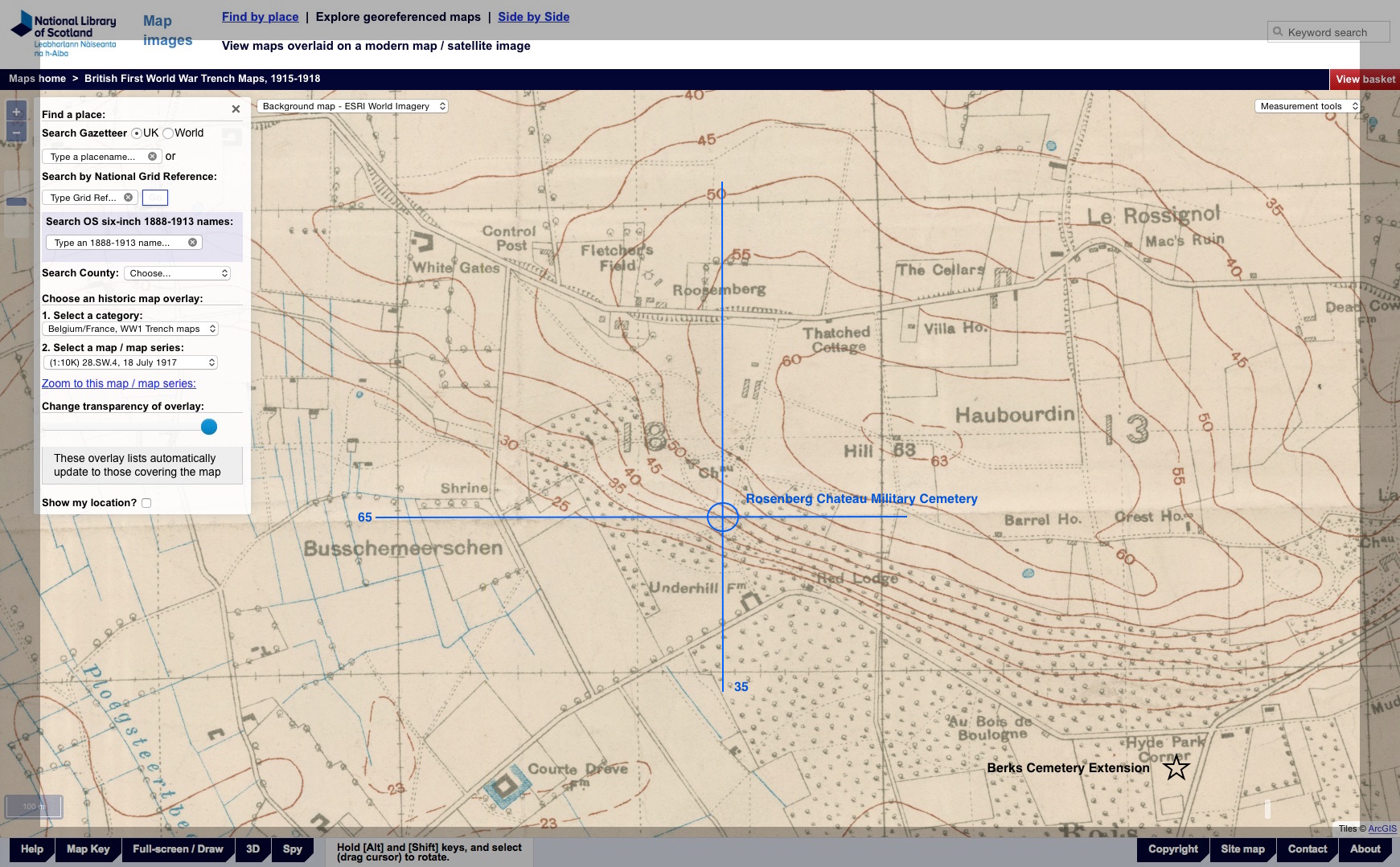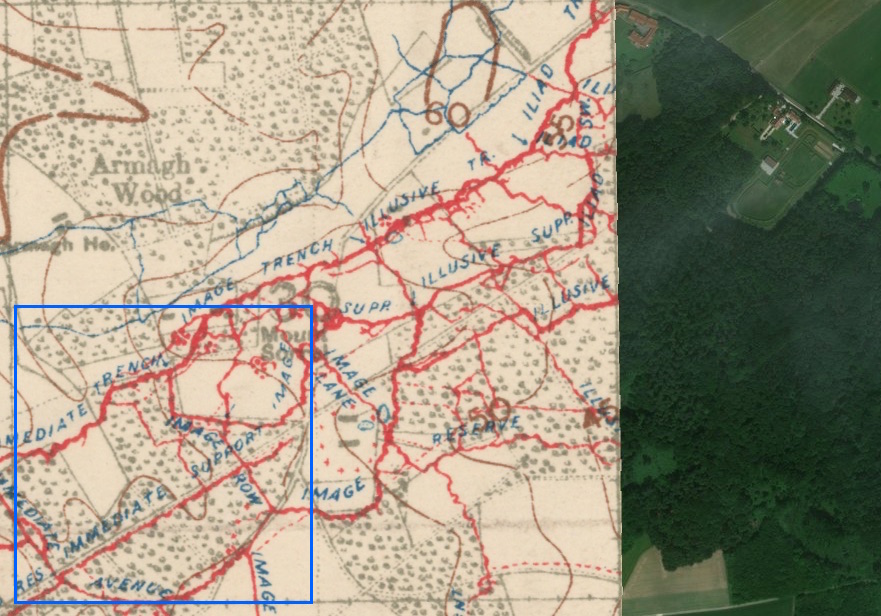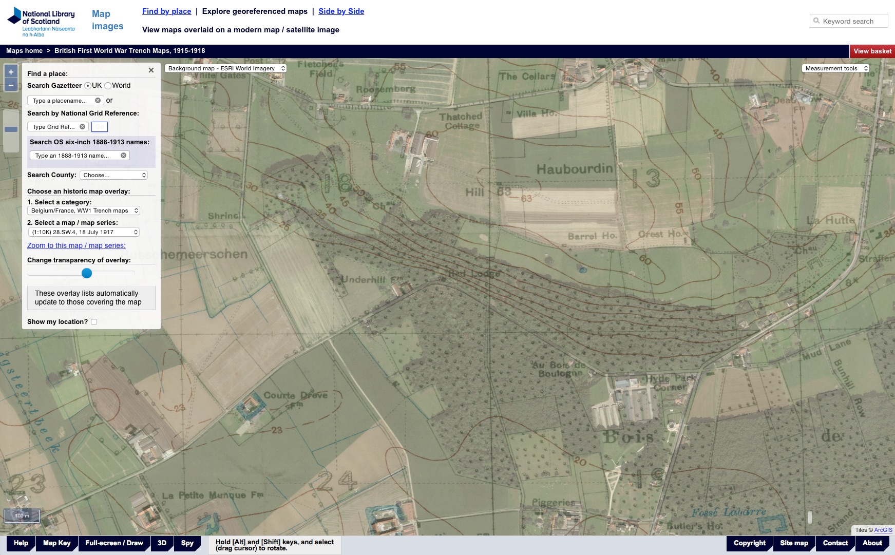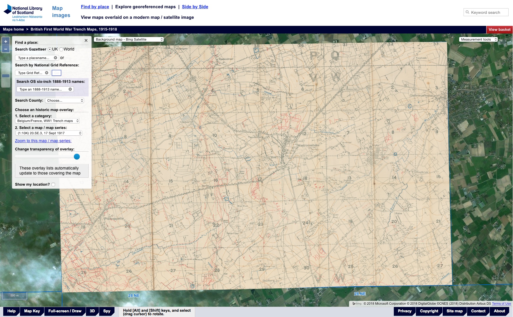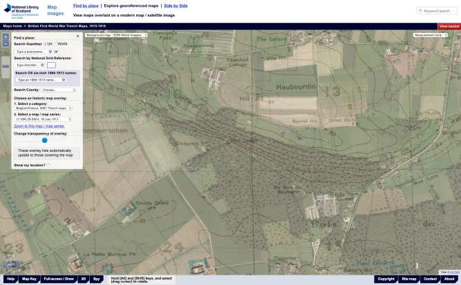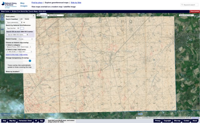 The image below is from a 1:20,000 trench map in the National Library of Scotland collection. You can use the transparency slider to fade the trench map and reveal a modern day Google map on the layer below.