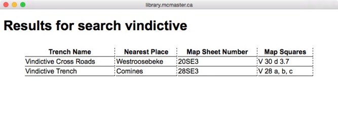These names often had little in common with terms used by the local population, assuming the place or feature had a name at all. Fortunately there are tools available to help you translate these place and trench names into map references, including Dr. Peter Chasseaud’s book, Rat’s Alley: Trench Names of the Western Front 1914-1918. Many of these references can also be found using the handy Place or Trench Name search tool on McMaster University’s WW1 Trench Maps and Aerial Photographs website. Entering “Vindictive” into the search tool at the top of the page and selecting the “Trench Names” radio button returns two results including “Vindictive Cross Roads” at 20SE3 V30d3.7: